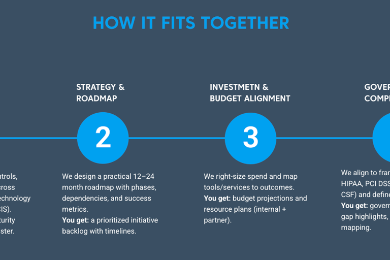 Teams have tools, but not a plan. Our Strategy & Roadmap engagement benchmarks your current posture, maps priorities to risk and compliance needs, and gives you a 12–24 month plan you can actually execute.