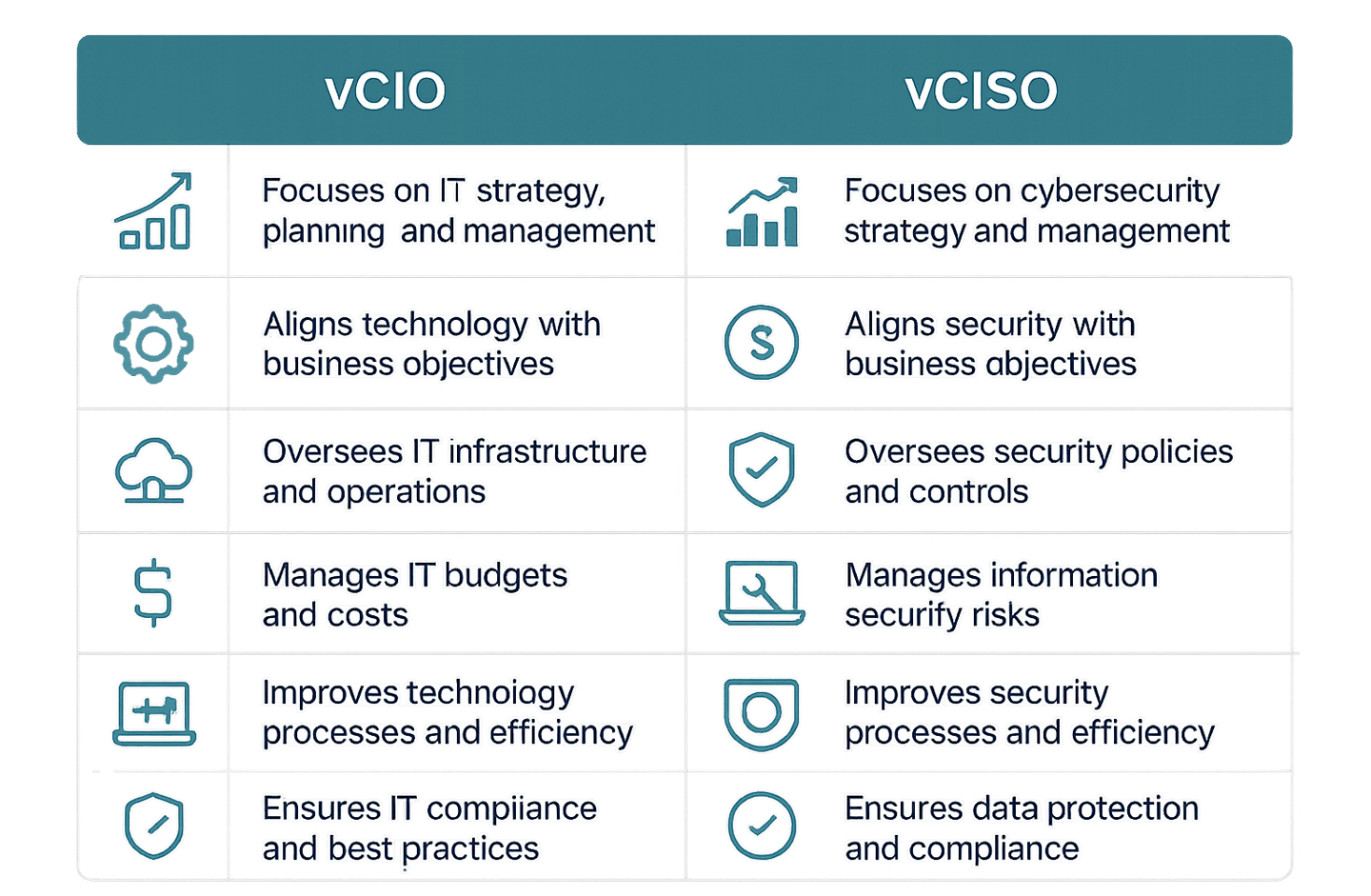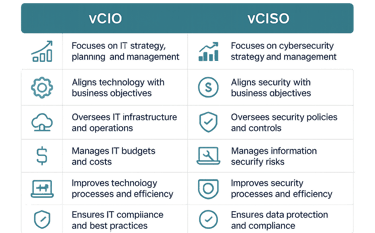 Our virtual CIO (vCIO) and virtual CISO (vCISO) services plug seasoned leadership into your organization without the full‑time overhead. We translate goals into roadmaps, risks into controls, and investments into measurable outcomes.